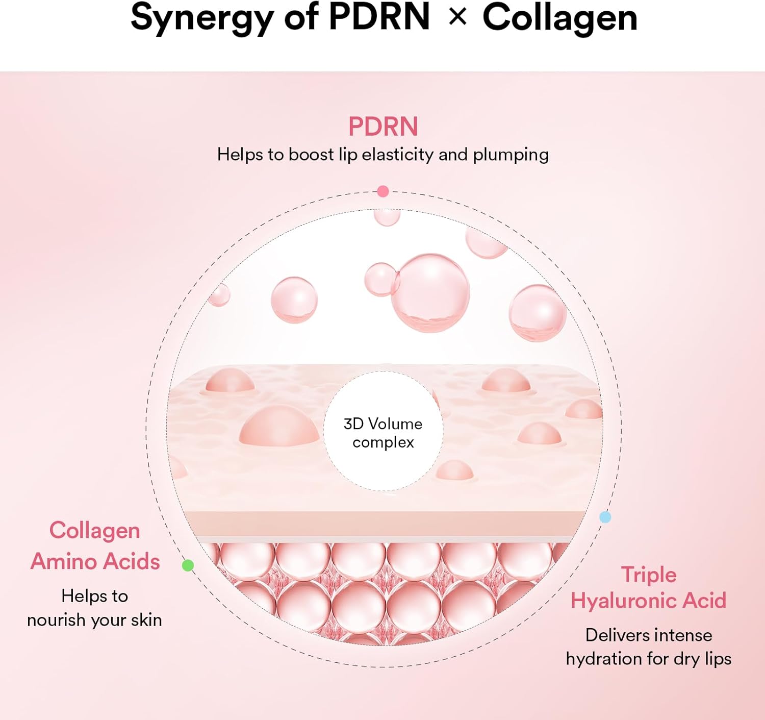 PDRN 3D Collagen Complex: Enriquecido com PDRN de origem vegetal e colágeno 3D para restaurar hidratação e elasticidade, criando lábios volumizados e macios.