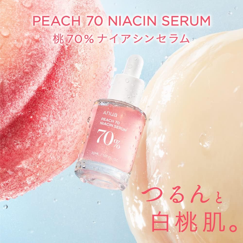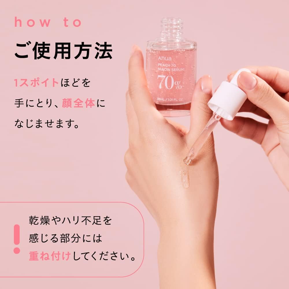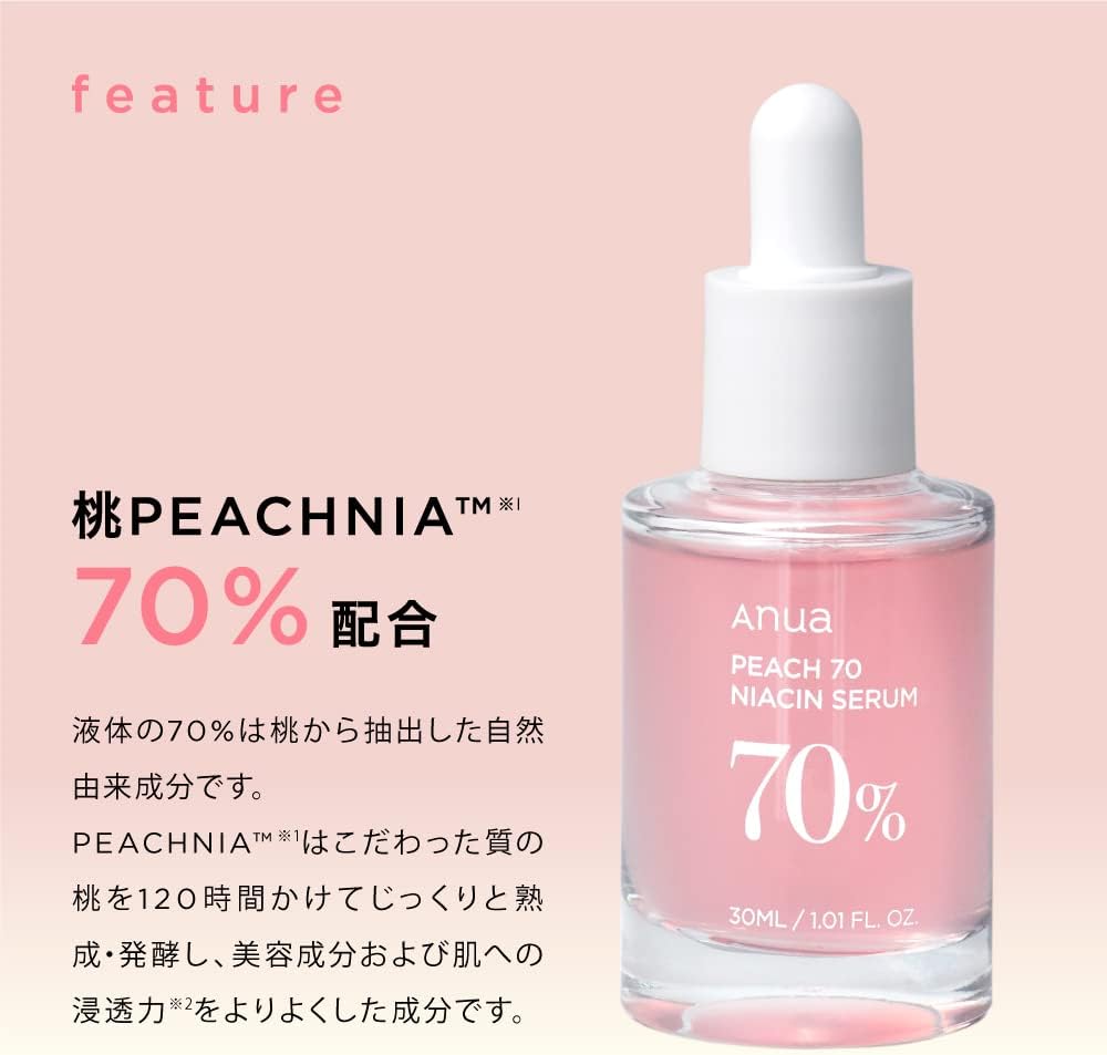 Contém 70% de PEACHNIA(TM), um ingrediente de origem natural extraído de pêssegos, e contém muitos ingredientes de beleza, como vitaminas, polifenóis e taninos para iluminar e iluminar sua pele. Além disso, contém 5% de niacinamida, que melhora a transparência da pele, e inibe a exposição da melanina, que causa manchas e sardas, na superfície da pele, resultando em uma pele transparente e clara. Ingredientes suaves de origem natural proporcionarão uma pele lisa e cor de pêssego, com belo tom, textura e brilho, sem agredir a pele.