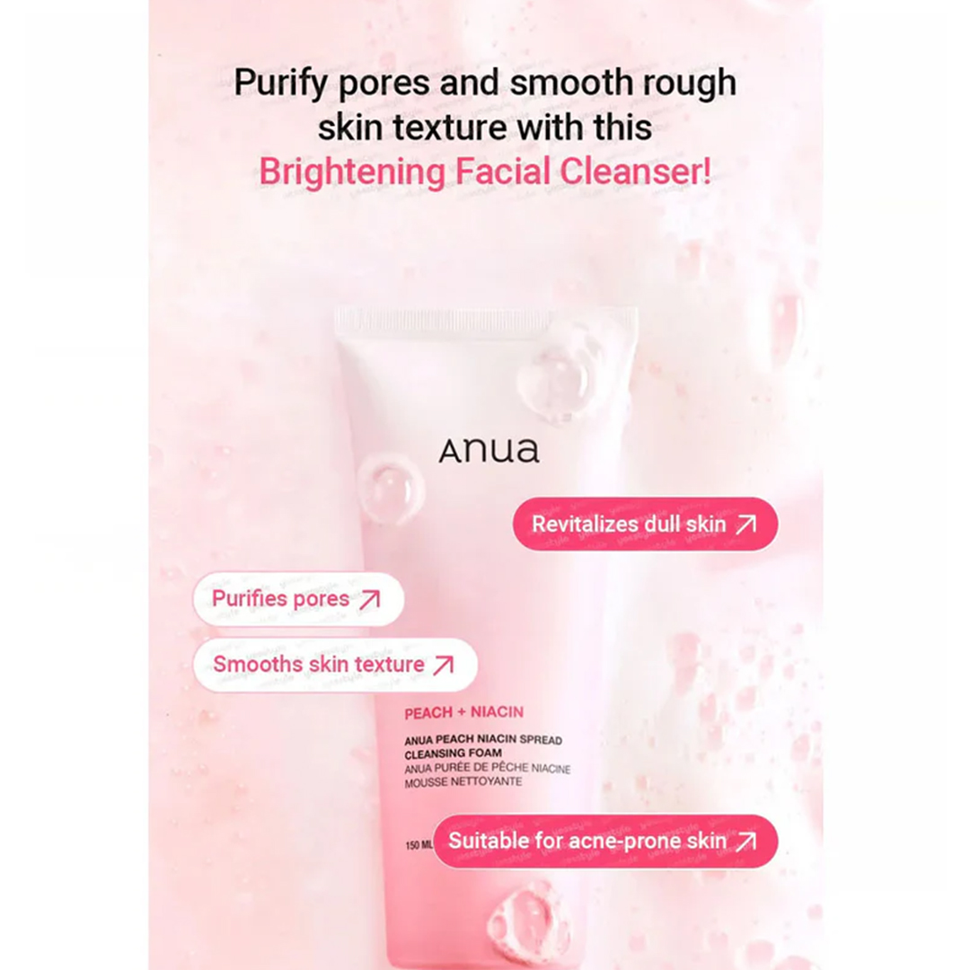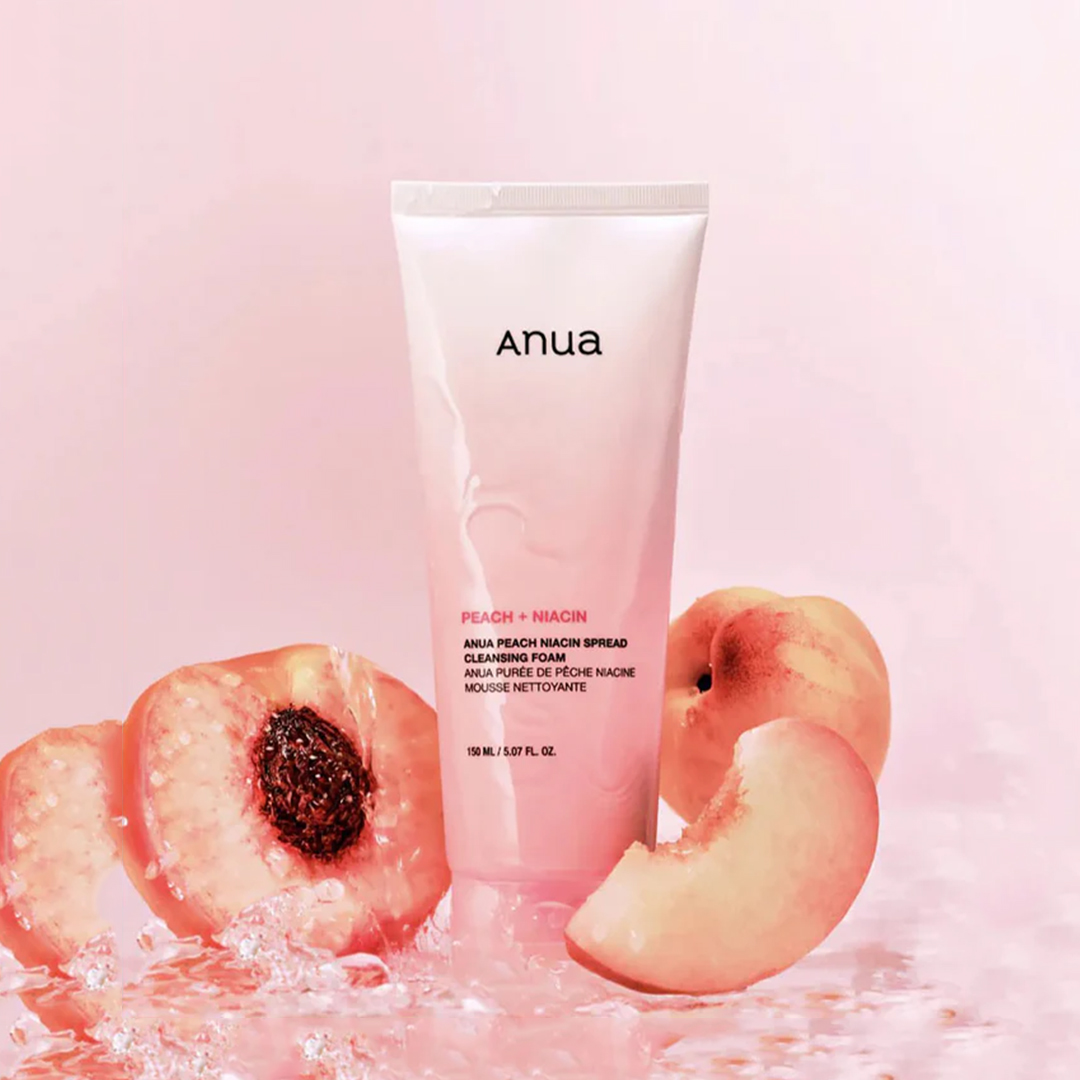 ANUA Peach Niacin Cleansing Foam (150 ml) é um sabonete de limpeza facial em espuma que combina niacinamida (vitamina B3) com extrato de pêssego e surfactantes suaves. Foi formulado para limpar a pele, remover sujeira, excesso de oleosidade e maquiagem leve, mantendo a pele com sensação suave e sem repuxar.