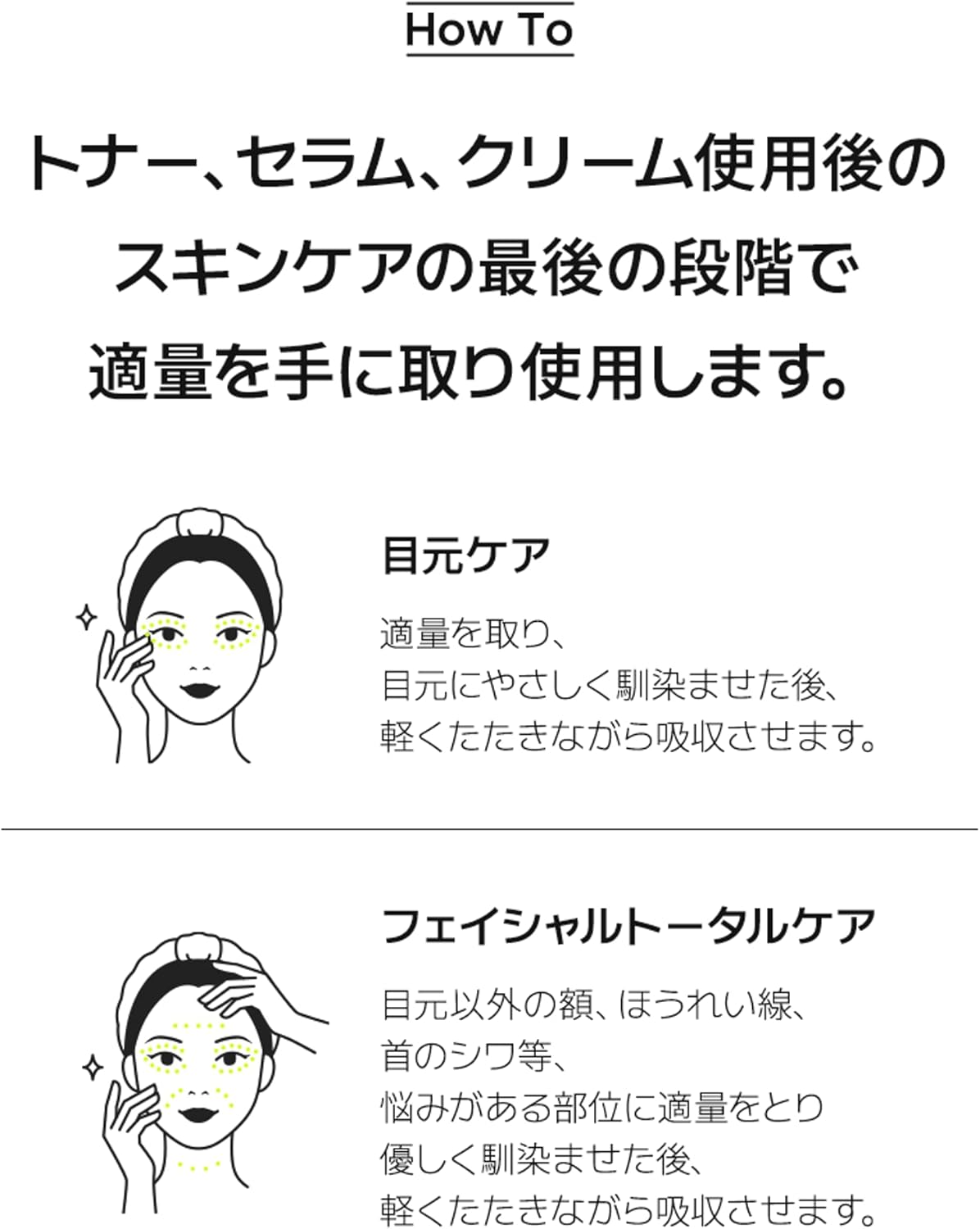 Pegue uma quantidade adequada e use na etapa final do cuidado da pele após usar toner, soro ou creme.