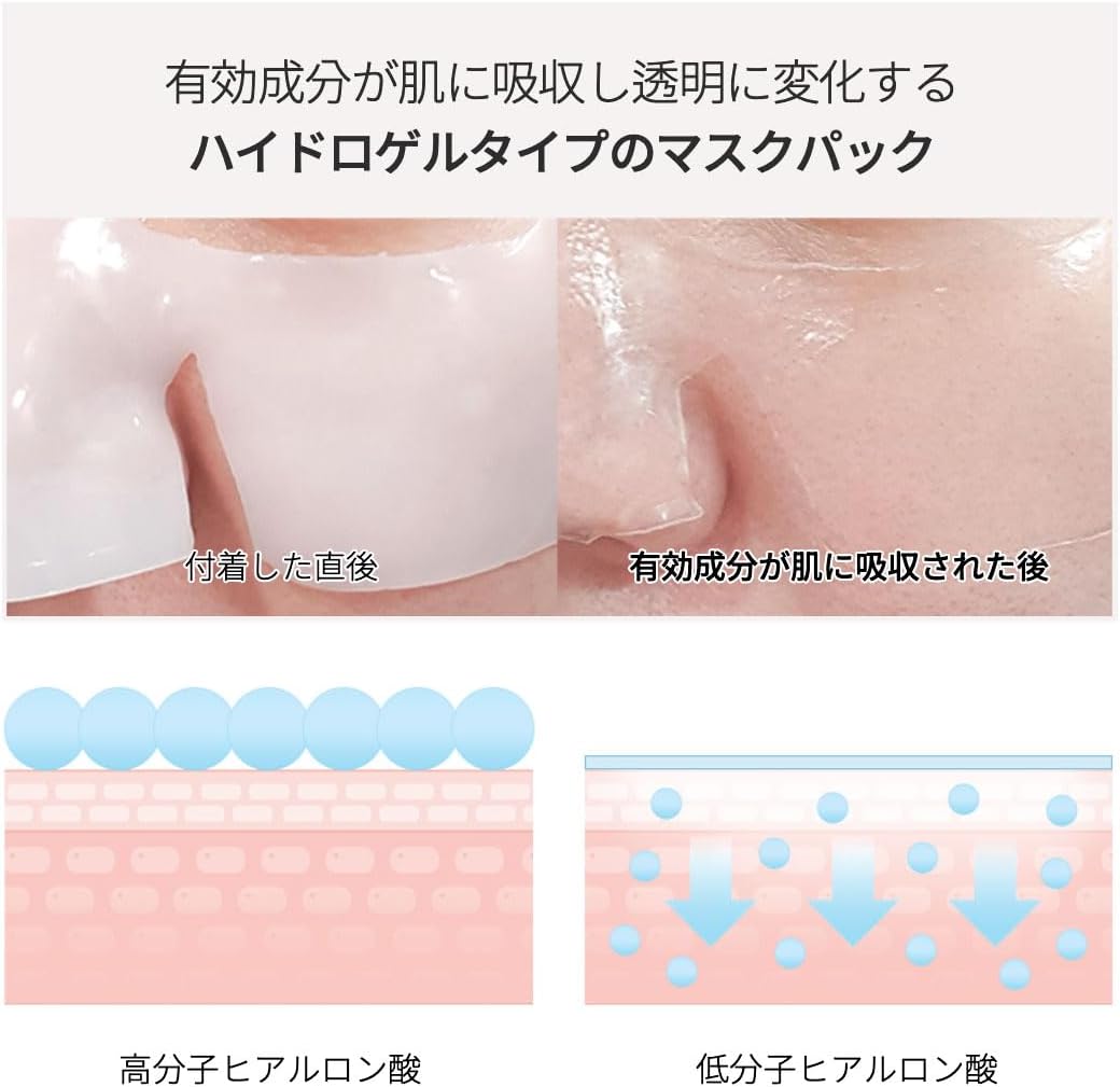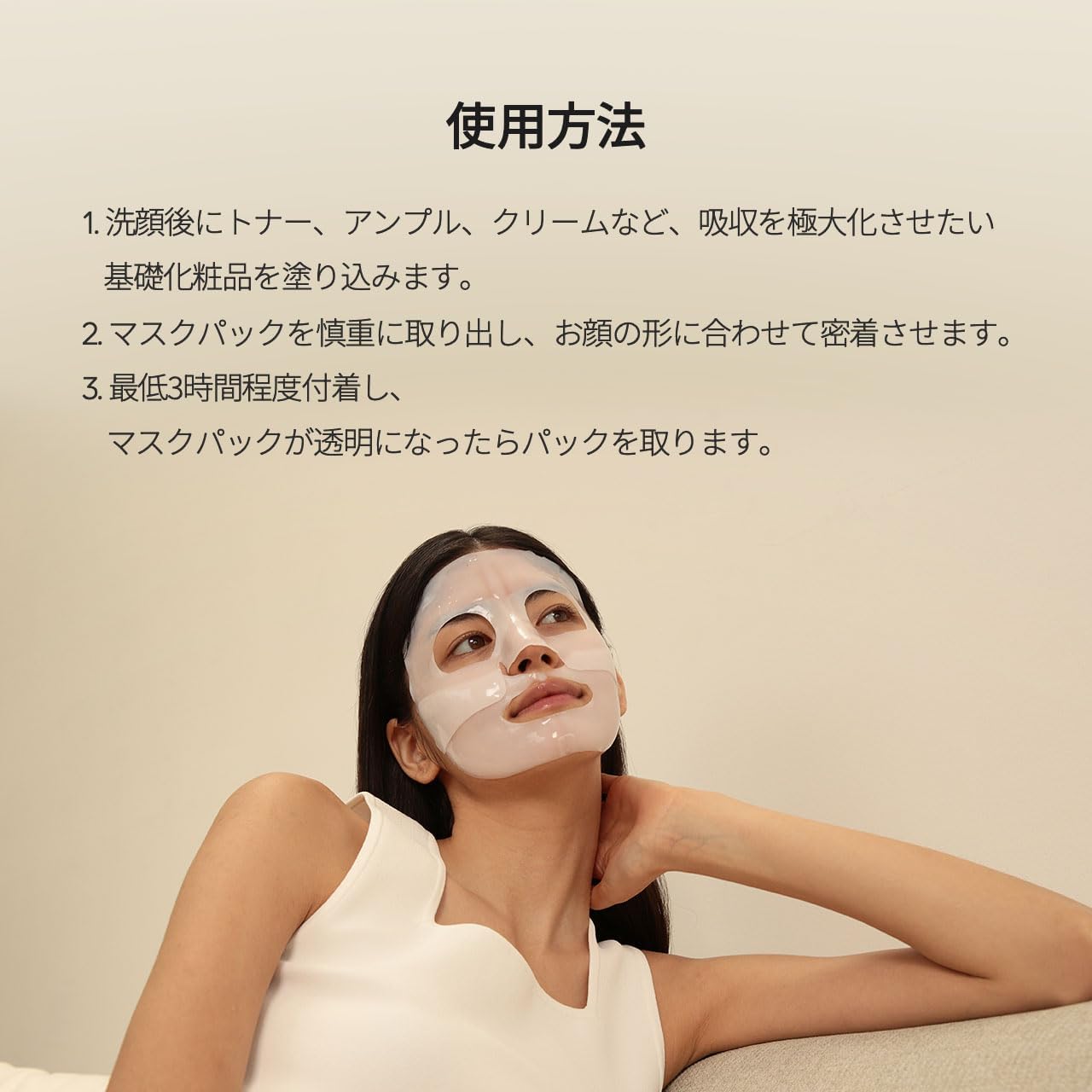 Esta é uma máscara em folha de hidrogel feita a partir da solidificação de 34g de ampolas altamente concentradas sem molhar a folha. Quanto mais a pele absorve os princípios ativos, mais transparente ela se torna.