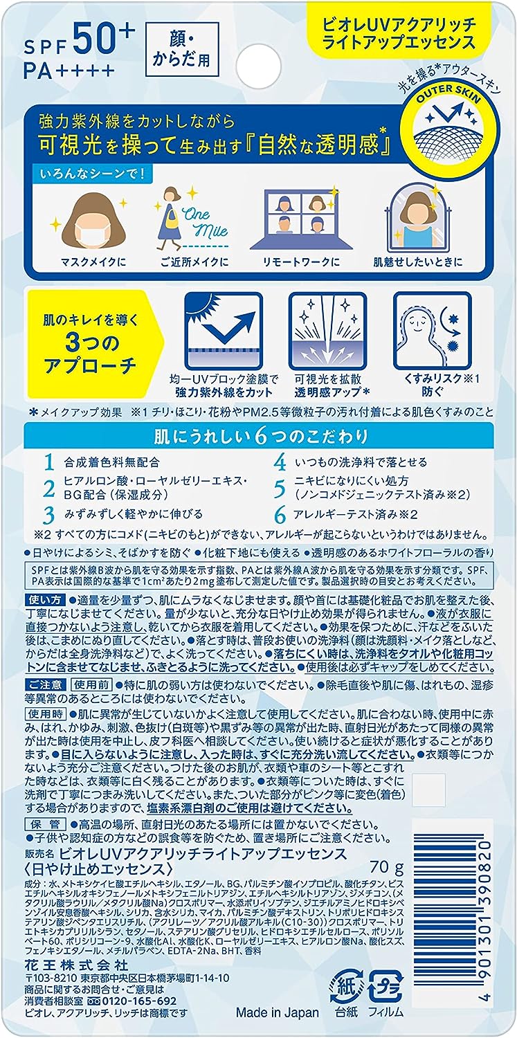 Transparência opaca e fofa *1. Proteção UV e transparência aprimorada. *1. Difusão de luz UV. Fornece uma transparência natural controlando a luz visível enquanto protege os fortes raios UV (SPF 50+PA+++). Evita o risco de embotamento *2. Previne manchas solares Essência suave e iluminadora Sem fórmula de coloração sintética. Impermeável Pode ser removido com sua taxa de lavagem regular. 1. Efeito de maquiagem: 2. Opacidade da cor da pele causada por sujeira de partículas.