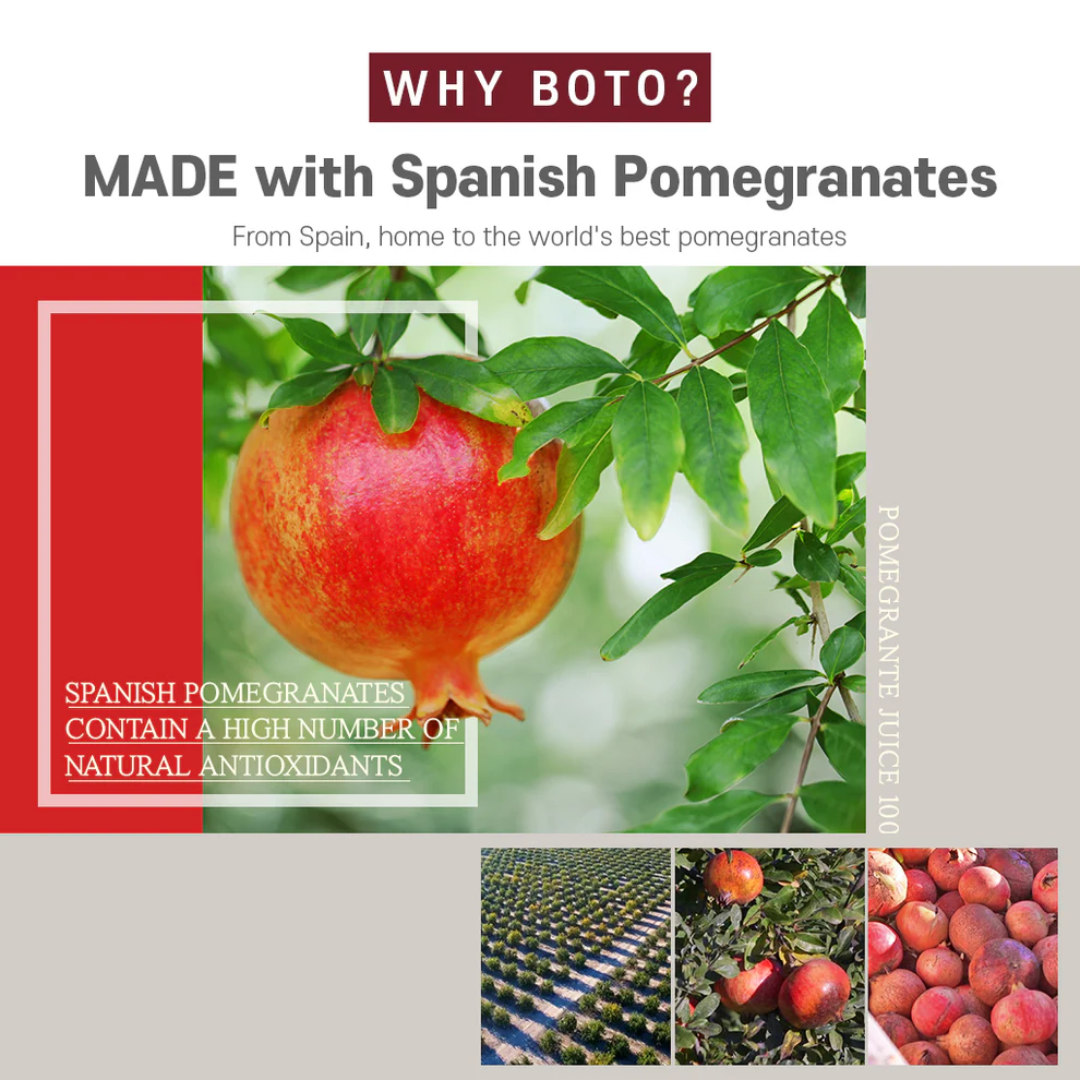 Suco 100% de romã premium espanhola, cuidadosamente selecionada por seu alto teor de açúcar e equilíbrio perfeito entre doçura e acidez. Rico em nutrientes como ácido elágico, coenzima Q-10 e estrogênio de origem vegetal, este suco oferece benefícios significativos para a saúde.