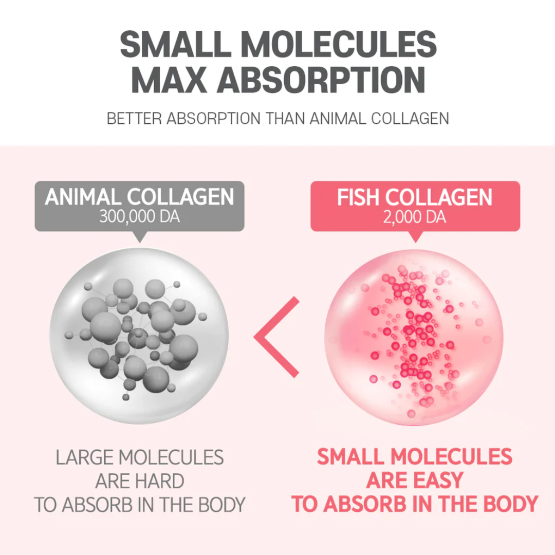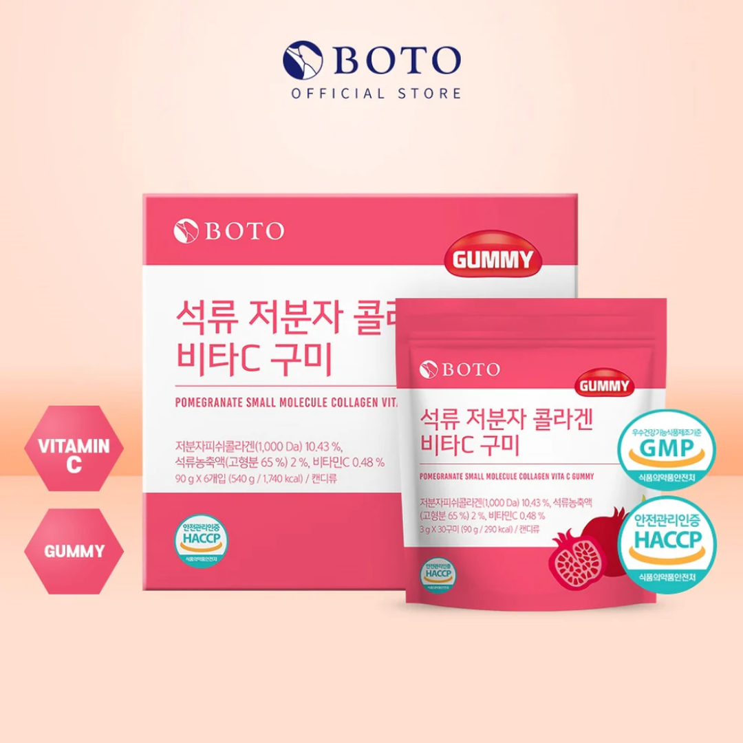 Açúcar, xarope de milho, colágeno de peixe de baixo peso molecular (10,43%), gelatina, frutooligossacarídeo (5%), solução de D-sorbitol, concentrado de romã (sólido, 65%, Espanha) (2%), ácido cítrico, aromatizantes sintéticos (sabor romã, sabor frutas mistas), vitamina C (Reino Unido), pectina, gorduras comestíveis processadas, ácido DL-málico, concentrado de cenoura preta, citrato de sódio, ésteres de ácidos graxos de glicerina, ácido hialurônico, fibra dietética de chicória, pó de extrato de Melissa officinalis.