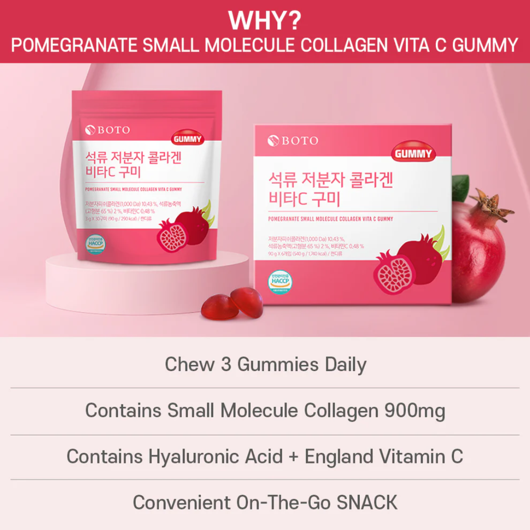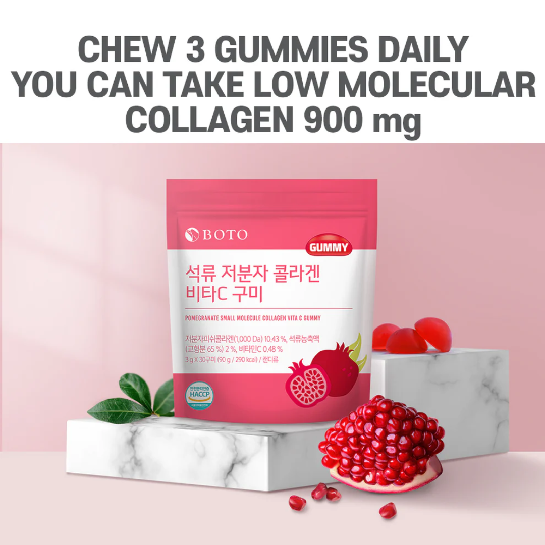 Suplemento em forma de gomas sabor romã, enriquecido com colágeno de baixo peso molecular, ácido hialurônico e vitamina C, que auxilia na manutenção da saúde da pele, promovendo elasticidade e hidratação.