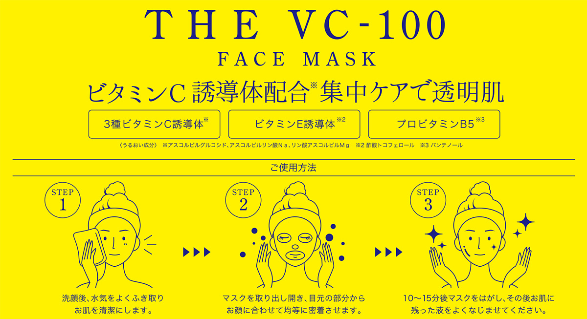 A máscara facial VC100 contendo ingredientes de beleza populares Contém 3 tipos de derivados vitamínicos (ascorbil glicosídeo, ascorbil fosfato de sódio e ascorbil fosfato de magnésio)