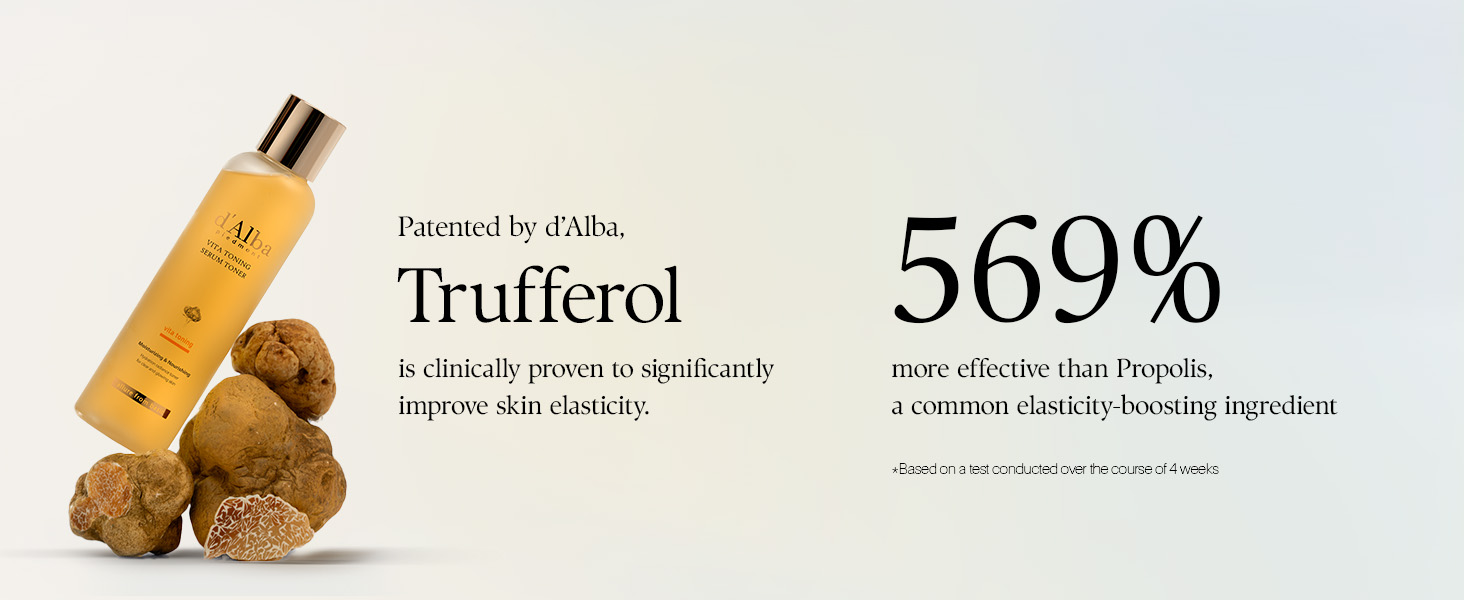 Trufferol™ patenteado: Comprovadamente melhora a elasticidade da pele 569% mais que a própolis, promovendo firmeza e aparência jovem.