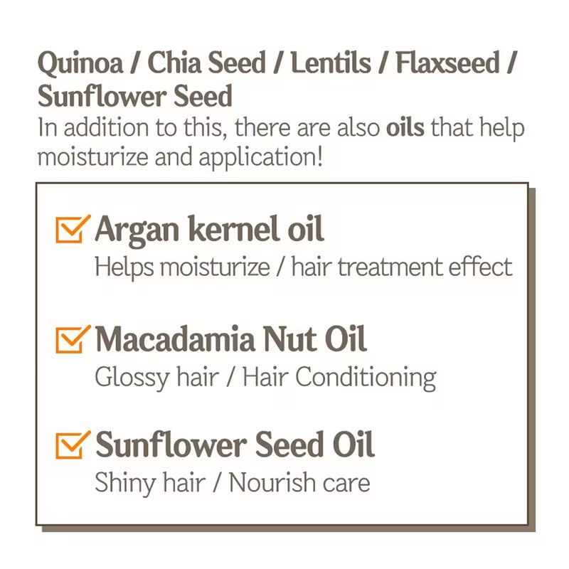 Água, Álcool Cetoestearílico, Cloreto de Behentrimônio, Amodimeticona, Cloreto de Cetrimônio, Glicerina, Álcool Isopropílico, Benzoato de Sódio, Trideceth-12, Fragrância, Ácido Cítrico, Pantenol, Ceramida NP, Óleo de Argania Spinosa, Óleo de Semente de Macadamia Integrifolia, Óleo de Semente de Helianthus Annuus (Girassol), Colágeno Hidrolisado (100 ppm), Gelatina, Queratina Hidrolisada, Extrato de Proteína de Avena Sativa (Aveia), Butilenoglicol, Proteína de Milho Hidrolisada, Proteína de Soja Hidrolisada, Proteína de Trigo Hidrolisada, 1,2-Hexanodiol, Extrato de Semente de Chenopodium Quinoa, Extrato de Semente de Salvia Hispanica, Extrato de Semente de Linum Usitatissimum (Linhaça), Extrato de Semente de Lens Esculenta (Lentilha), Extrato de Semente de Helianthus Annuus (Girassol)