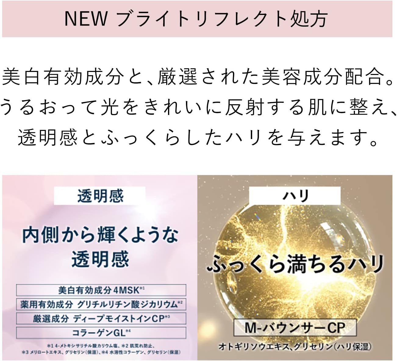 Loção branqueadora medicamentosa para pele que continua “brilhante” cheia de transparência e firmeza. Clareamento *& Cuidados de Envelhecimento** Deixa a pele cheia de transparência e crocância que dura. Loção clareadora medicamentosa A chave para a transparência é que sua pele reflete lindamente a luz. Fórmula reflexiva brilhante com ingredientes ativos clareadores cria uma sensação de transparência, pele hidratada e refletora de luz. Também é formulada com ingredientes de beleza para dar à sua pele uma elasticidade e firmeza. Elimina pequenas rugas do ressecamento. (Eficácia testada) Previne a produção de melanina, evita manchas, sardas. *Cuidado hidratante para idades.