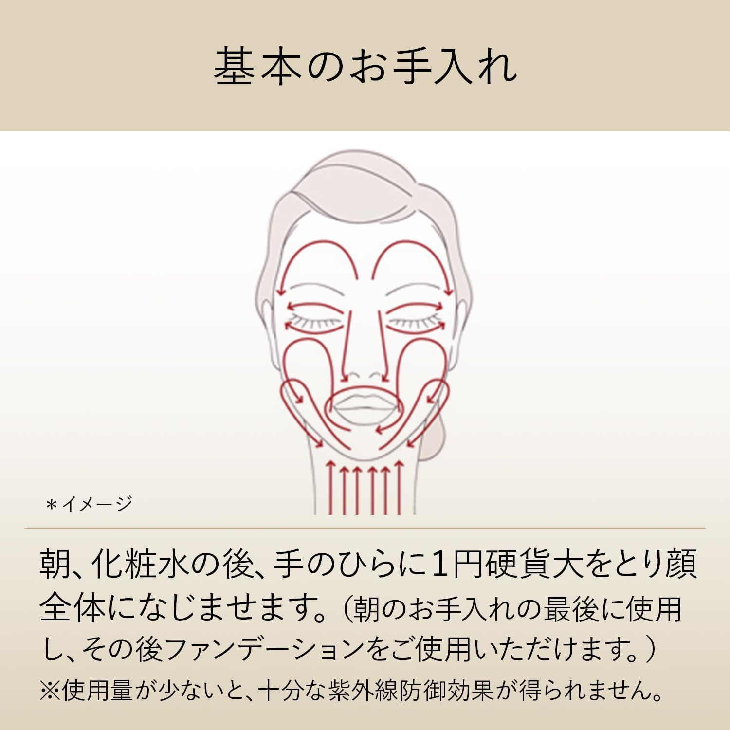 De manhã, após a loção, coloque uma quantidade do tamanho de uma moeda de 1 iene na palma da mão e espalhe por todo o rosto. (Use-o no final da sua rotina matinal de cuidados com a pele e depois aplique a base.) ●Se usar muito pouco, não obterá proteção UV suficiente.