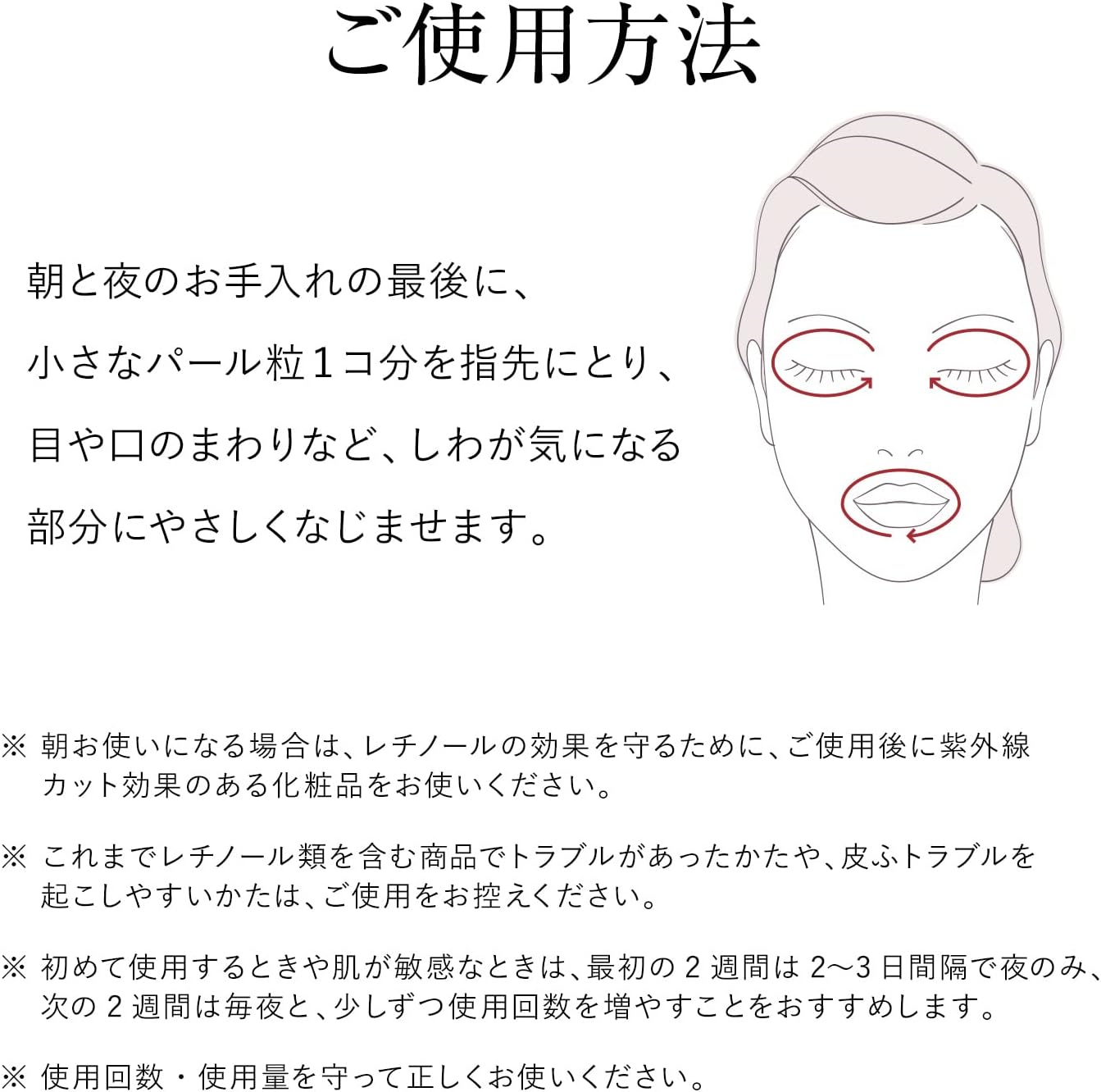 No final da manutenção matinal e noturna, pegue 1 pequeno grão de pérola na ponta dos dedos e misture suavemente nas áreas que apresentam rugas, como ao redor dos olhos e da boca. Para proteger o efeito do retinol, utilize produtos cosméticos com proteção UV após o uso. Evite usar este produto se tiver algum problema com retinóis ou se tiver tendência a irritações na pele. Ao usar pela primeira vez ou com pele sensível, recomenda-se aumentar o número de vezes todas as noites apenas em 2 a 3 dias durante as primeiras 2 semanas e todas as noites durante as 2 semanas seguintes. Por favor, use este produto corretamente de acordo com quantas vezes ele é usado e quantas vezes é usado. Retinol puro que é sensível ao oxigênio. Um tubo especial é usado para impedir a entrada de oxigênio. Um mecanismo especial que não reverte o conteúdo do ar uma vez cheio de ar. Filtro de parede de ferro que não permite uma única agulha vinda do exterior. Estamos empenhados em proteger a eficácia. ] Como abri-lo? 1. Abra a tampa e remova o anel azul. 2. Coloque a tampa diretamente no tubo. 3. Enrosque a tampa até que a parte irregular da raiz não fique visível. Pontos importantes: Se a tampa estiver inclinada, ela não será aberta corretamente. Quando o parafuso estiver doce (onde a parte irregular da raiz é visível), o ar se espalhará facilmente. Enrosque a tampa até que a parte irregular da raiz não fique visível. Pontos importantes: Se a tampa estiver inclinada, ela não será aberta corretamente. Quando o parafuso estiver doce (onde a parte irregular da raiz é visível), o ar se espalhará facilmente. Enrosque a tampa até que a parte irregular da raiz não fique visível. Pontos importantes: Se a tampa estiver inclinada, ela não será aberta corretamente. Quando o parafuso estiver doce (onde a parte irregular da raiz é visível), o ar se espalhará facilmente.