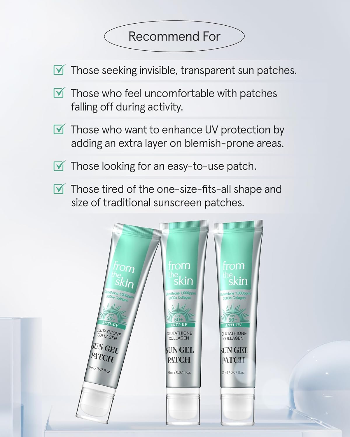 O From The Skin Glutathione Collagen Sun Gel Patch é um patch solar em formato de gel transparente, desenvolvido pela marca sul-coreana From the Skin. Ele cria um filme fino invisível que protege contra os raios UVA/UVB enquanto entrega ativos de cuidado da pele — como glutatião e colagénio — ideal para área do rosto que precisa de proteção localizada e acabamento.