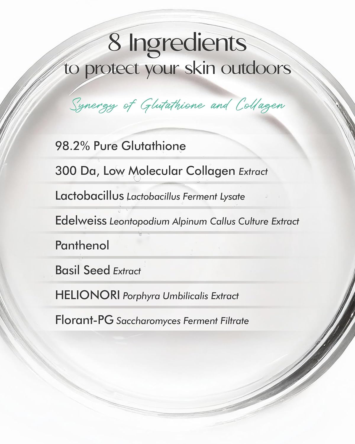 Água, álcool polivinílico, glicerina, glicereth-26, fenil trimeticone, butileno glicol, ureia hidroxietílica, dipropileno glicol, hidroxiacetofenona, 1,2-hexanodiol, glutatião, acrilatos/C10-30 alquil acrilato copolímero, arginina, poliglir-10 miristato, poliglir-10 estearato, pantenol, fragrância, acetato de sódio, lecitina hidrogenada, caprilil glicol, dissódio EDTA, decil glucosídeo, extrato de colagénio, extrato de Cynanchum Atratum, extrato de Porphyra Umbilicalis, goma xantana, lisado de fermento de lactobacilos, extrato de cultura de calos de Leontopodium Alpinum, extrato de semente de manjericão (Ocimum Basilicum), extrato de Panax Ginseng, fermento de Saccharomyces, etilhexilglicerina, ácido glucurônico.