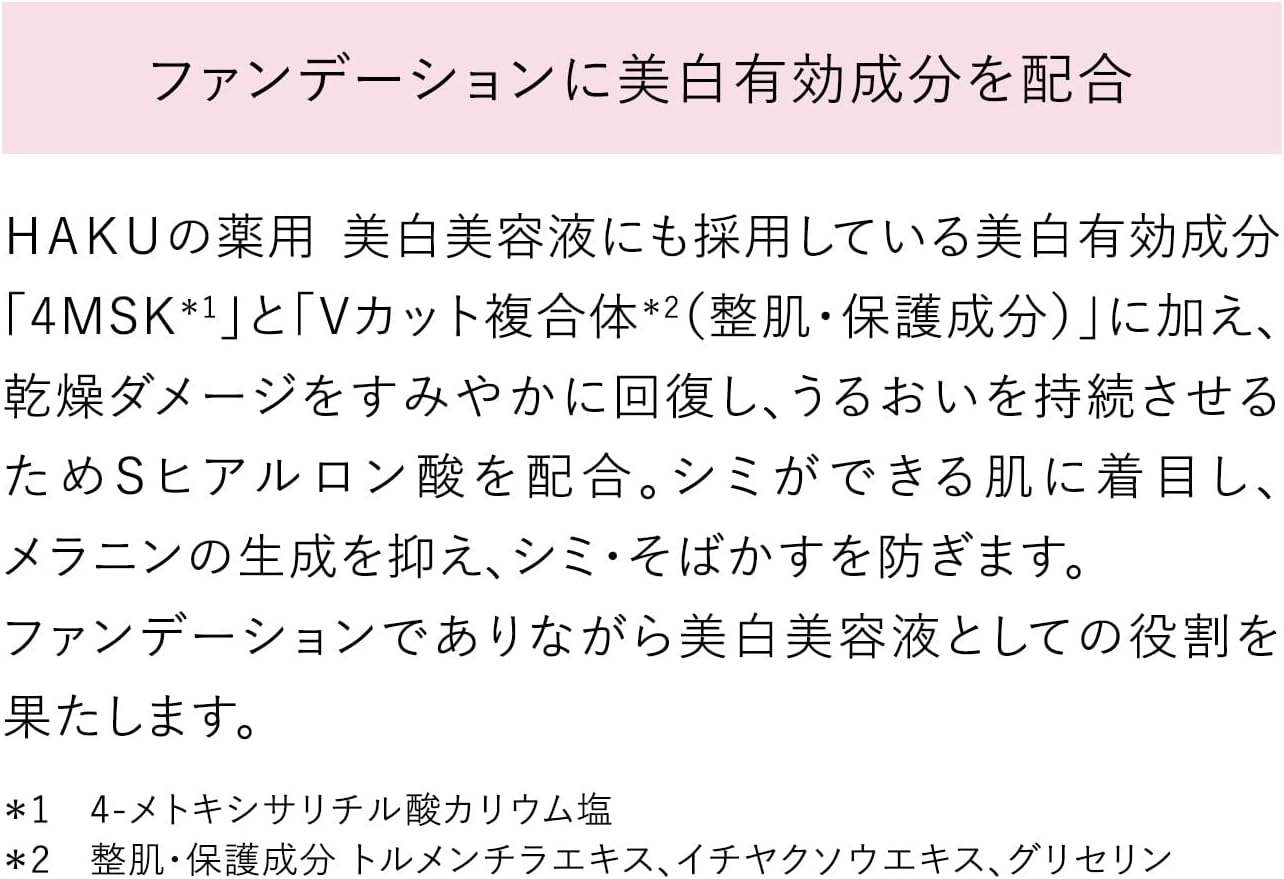 Sal de potássio do ácido 4-metoxisalicílico*, acetato de DL-α-tocoferol*, ectoína, extrato de cravo-da-índia, extrato de Ichiyakusou, extrato de tormentilla, extrato de lírio, cloridrato de glucosamina, extrato de Lumpuyan, ácido 2-O-etil-L-ascórbico, extrato de artemísia ( 2) ), hialuronato de sódio acetilado, água purificada, decametiltetrasiloxano, metilpolissiloxano, etanol, glicerina concentrada, pó de náilon, parametoxicinamato de 2-etilhexila, succinato de di2-etilhexila, PEG-9 polidimetilsiloxi etil dimeticona, copolímero de polioxietileno/metilpolissiloxano, dodecametilciclohexasiloxano, sorbitano se esquiisoestearato, trimetilsiloxissilicato, hidróxido de alumínio, ácido esteárico, hectorita de dimetildistearilamônio, isoparafina leve, mistura de silicone modificado com poliéter reticulado, edetato trissódico, 1,3-butilenoglicol, tetrahidrotetrametilciclotetrassiloxano, dibutilhidroxitolueno, tetradeceno, ácido cítrico, citrato de sódio, d-δ-tocoferol, dipropileno glicol, hidrogênio metílico Polissiloxano, pirossulfito de sódio, óxido de alumínio, fenoxietanol, óxido de titânio, óxido de ferro amarelo, óxido de ferro vermelho, mica revestida com óxido de ferro vermelho titânio, mica, sulfato de bário, óxido de ferro preto