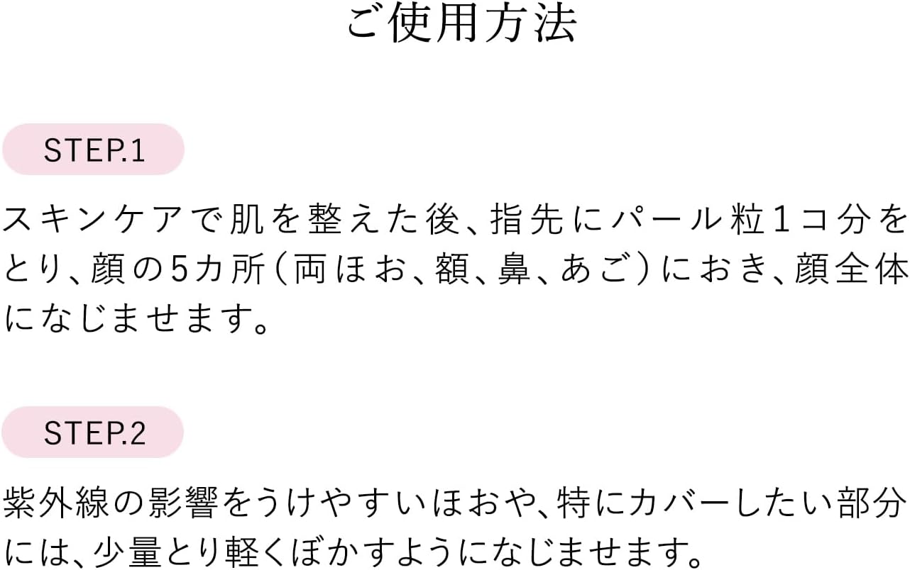 ●Depois de preparar a pele com cuidados com a pele, coloque 1 grão de pérola na ponta dos dedos, coloque em 5 áreas do rosto (bochechas, testa, nariz, queixo) e aplique uniformemente em todo o rosto.