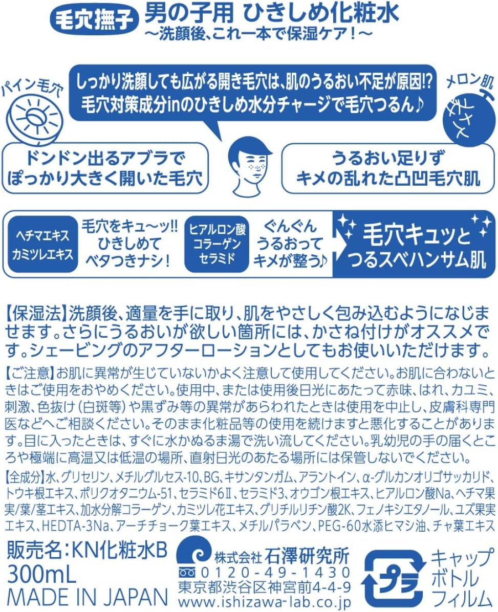 Feche os poros dilatados dos rapazes! Mesmo após uma boa limpeza, os poros abertos podem ser causados pela falta de hidratação na pele. Um ingrediente especialmente formulado para combater poros ajudará a suavizá-los, deixando sua pele impecável ♪. A oleosidade excessiva pode fazer com que os poros se abram novamente, mas o extrato de abacaxi ajuda a evitar isso. Para pele com textura irregular e poros ásperos devido à falta de umidade, o extrato de bucha e o extrato de camomila ajudam a fechar os poros. Além disso, o ácido hialurônico, o colágeno e a ceramida hidratam profundamente, melhorando a textura e deixando os poros mais firmes, suaves e bonitos!