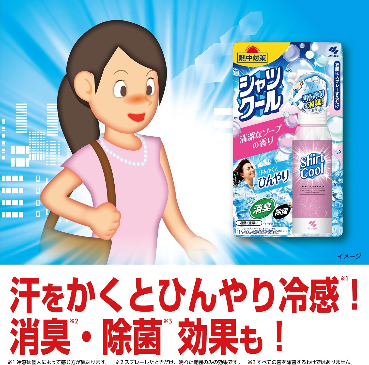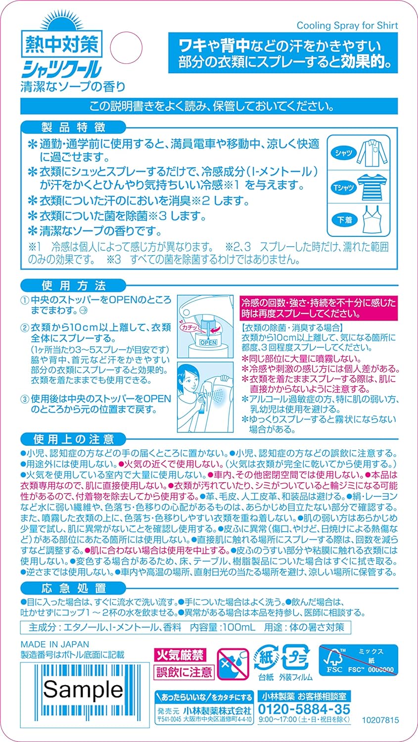 Quando você vai para o trabalho ou para a escola, o L-Mentol vai lhe dar uma sensação refrescante e mantê-lo fresco. Basta borrifar nas roupas para resfriá-las. Eficaz por pulverização em roupas propensas a suar, como axilas e costas. L Mentol esfria cada vez que você sua. A sensação de frescor é diferente de indivíduo para indivíduo. Aroma suave de sabonete.
