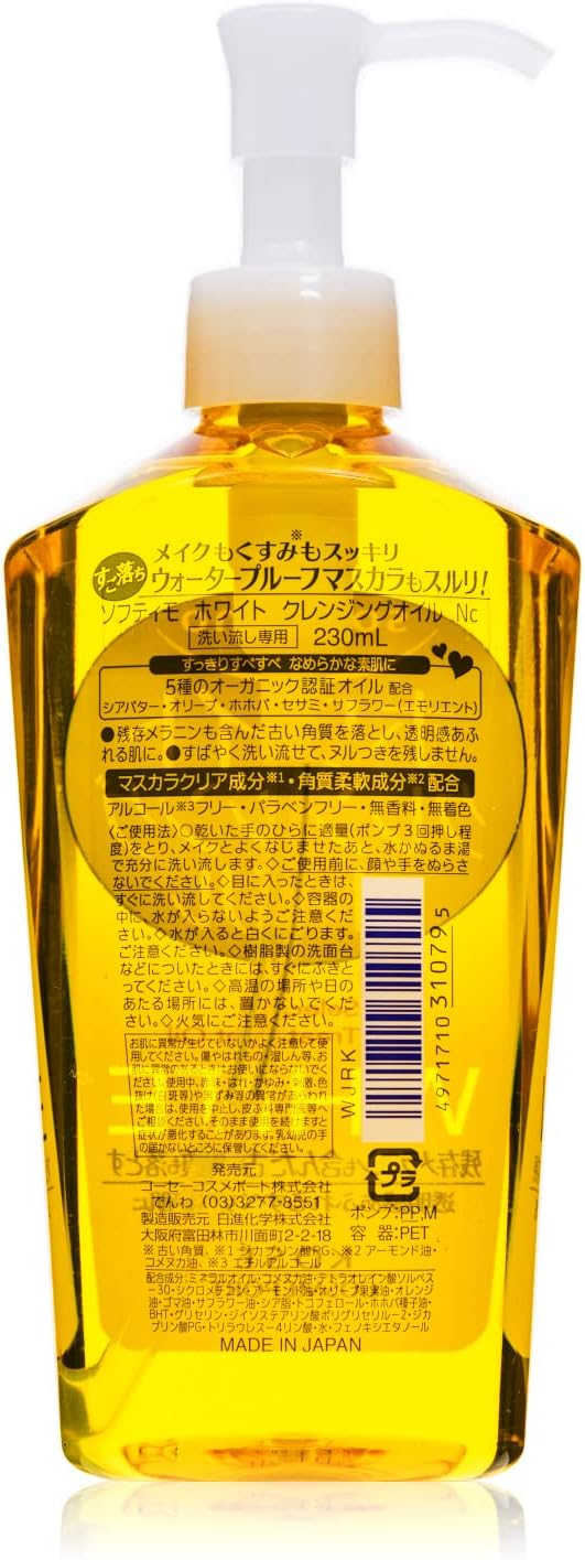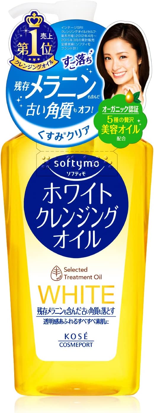 Softymo White Cleansing Oil é um óleo de limpeza japonês que ajuda a remover as células mortas da pele para uma pele mais brilhante. Ele remove suavemente a maquiagem e as impurezas que obstruem os poros e as células mortas da pele que contêm melanina, sem ressecar a pele. Ele enxágua completamente sem deixar resíduos oleosos, tornando desnecessária a limpeza dupla. O óleo de limpeza foi renovado em 2016 para remover melhor o rímel teimoso e as células mortas da pele. Uma nova mistura luxuosa de 5 óleos orgânicos certificados (azeite, óleo de jojoba, óleo de gergelim, óleo de cártamo e manteiga de karité) mantém a pele macia e hidratada.