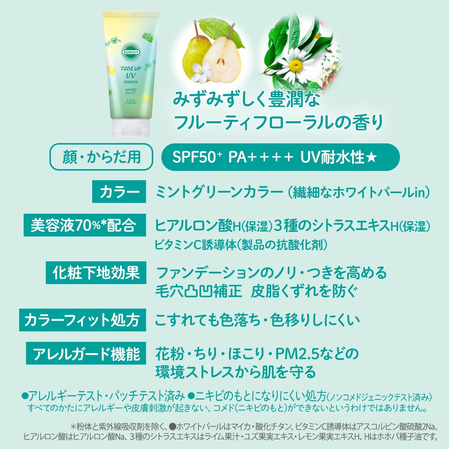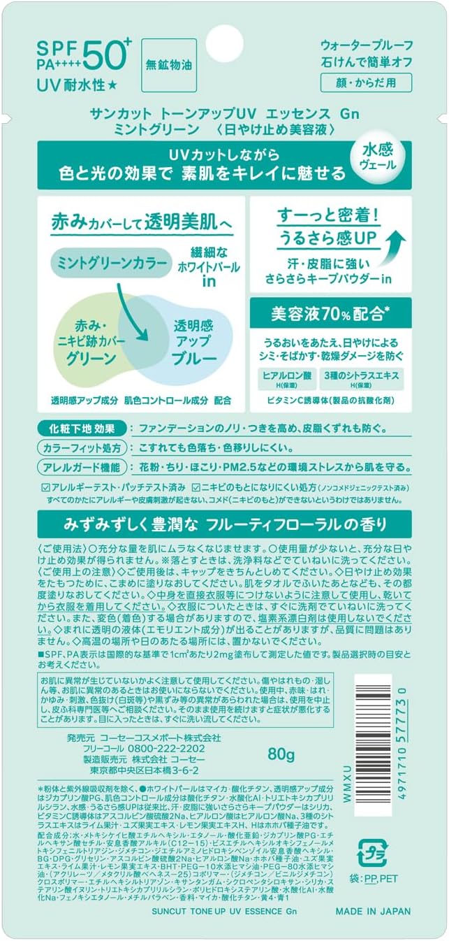 Água, metoxicinamato de etilhexilo, etanol, óxido de zinco, dicaprato de PG, etilhexanoato de cetilo, benzoato de alquilo (C12-15), bisetilhexiloxifenol metoxifeniltriazina, dimeticona, benzoato de dietilaminohidroxibenzoilhexilo, BG, DPG・Glicerina・Sulfato de ácido ascórbico dissódico・Hialuronato de sódio・Semente de jojoba óleo・Extrato de frutas Yuzu・Suco de limão・Extrato de frutas de limão・BHT・Óleo de rícino hidrogenado PEG-10・Óleo de rícino hidrogenado PEG-80・(Acrilatos/ácido metacrílico) Behenes-25) Copolímero, (dimeticona/vinil dimeticona) polímero cruzado, etilhexil triazona, goma xantana, ciclopentasiloxano, sílica, estearato de inulina, trietoxicaprililsilano, ácido poli-hidroxiesteárico, hidróxido de Al, hidróxido de Na, fenoxietanol, metilparabeno, fragrância, mica, óxido de titânio, amarelo 4, azul 1