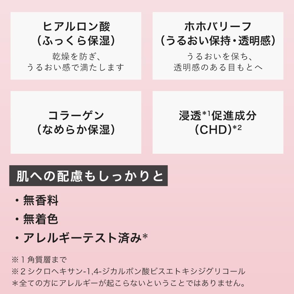 Água, etanol, BG, glicerina, sorbitol, proteoglicano solúvel em água, extrato de folha de pimenta, ácido hialurônico sódico, extrato de folha de jojoba, colágeno hidrolisado, ciclohexano-1,4-dicarbonato visediglicol, esqualano, polissorbato 80, xano, xantan tangum, glicosiltrehalose , HE, DTA-3Na, (acrilato de sódio, acrilato de sódio), copolímero, amido hidratado hidrolisado, oleato de sorbitano, mentol, isohexadecano, fenoxietanol, metilparabeno