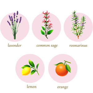 Lavender Oil, Sage Oil, Rosemary Oil, Lemon Oil, Orange Oil (Fragrance), Polysorbate 81, L-Menthol, Parapen, Edetoate