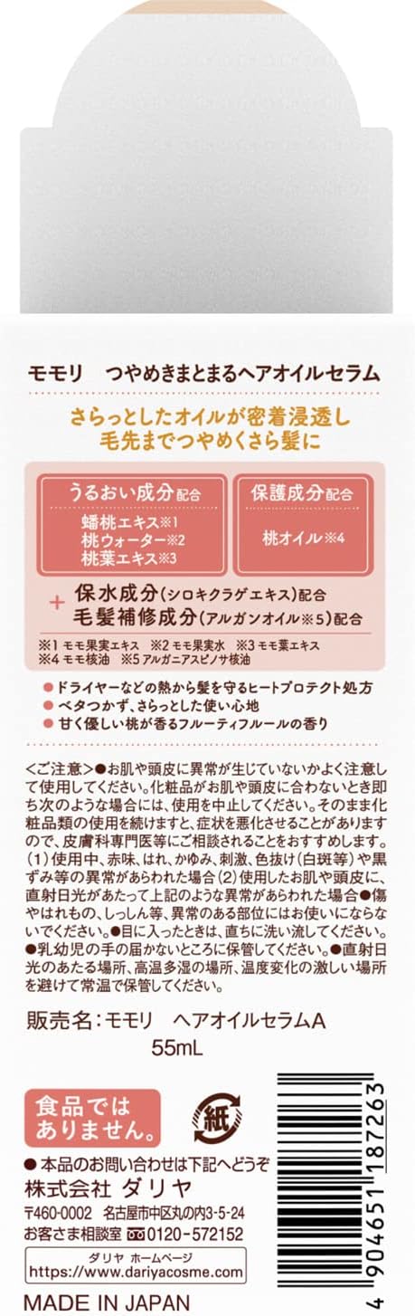 Dimethicone, isopropyl myristine, dimethiconol, argania spinosa nuclear oil, Game-docosaracton, white jellyfish extract, (dimethicone / vinyl dimethicon) cross polymer, tri (capricylic acid / caprinic acid / caprine) glyceryl, phenoxyethanol, water, pomethanol nucleus oil, peach fruit extract, peach fruit water, morine water, mium fruit extract, mo. Leaf extract, BG, (C12-14) Palace-3, Fragrance
