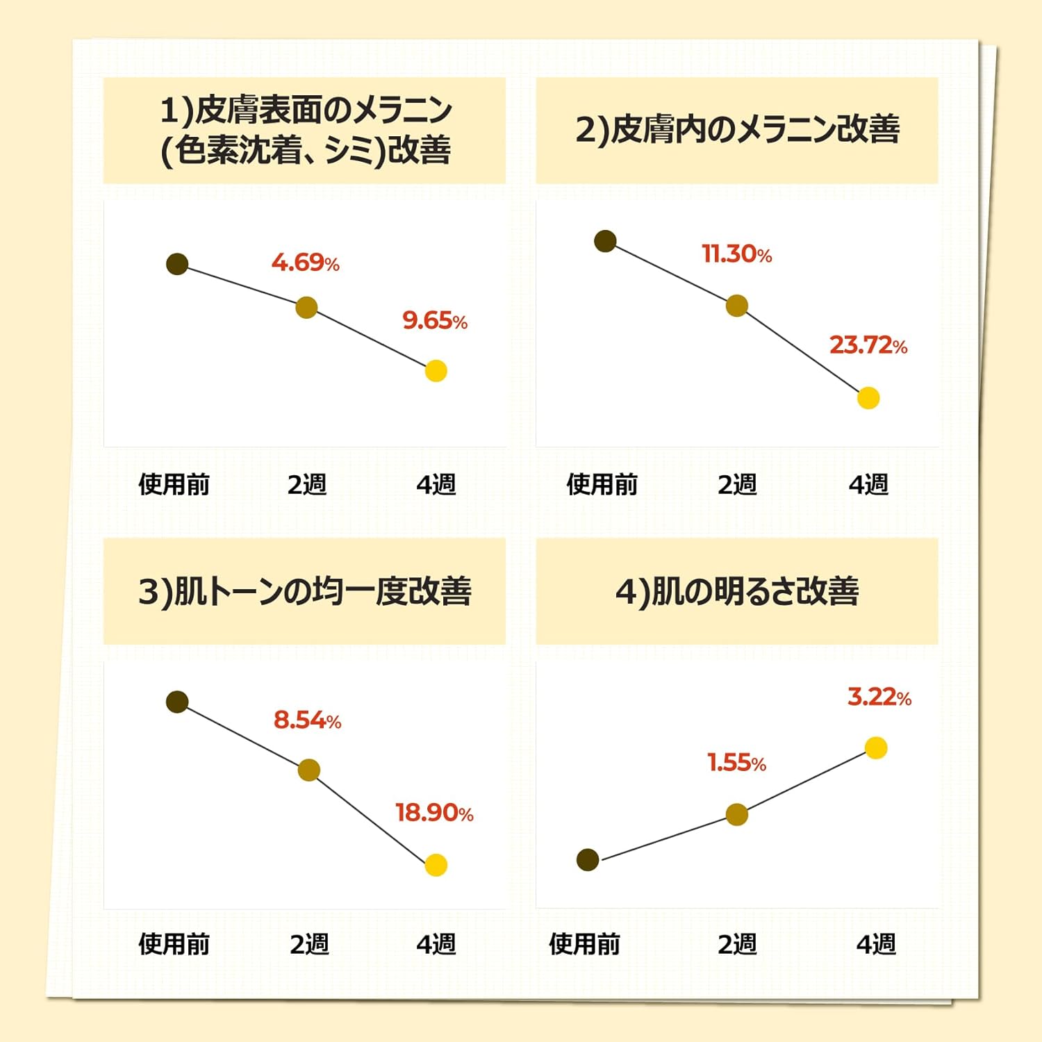 A melanina da superfície da pele melhorou 4,79% após 2 semanas de uso, 9,65% após 4 semanas de uso, a melanina interna da pele melhorou 11,30% após 2 semanas de uso, 23,72% após 4 semanas de uso, tom de pele 8,54% após 2 semanas de uso. uso, 4 semanas de melhora de 18,90% após o uso, o brilho da pele mostra melhora de 1,55% após 2 semanas de uso e melhora de 3,22% após 4 semanas de uso.