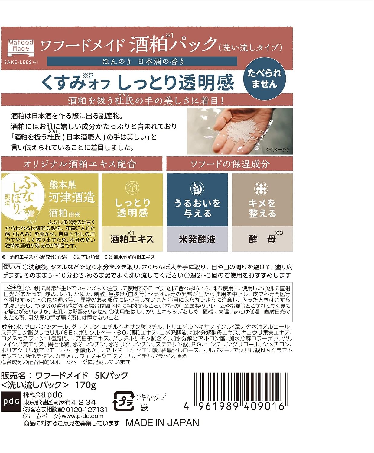 Elimine a opacidade e melhore a hidratação e a luminosidade! Nosso pacote de lavagem contém extrato original de borras de saquê, um ingrediente hidratante que remove as células mortas da pele. As borras de saquê são um subproduto da fabricação do saquê, famoso por seus benefícios de beleza. Diz-se que as mãos dos artesãos de saquê, que manuseiam as borras, são especialmente bonitas.