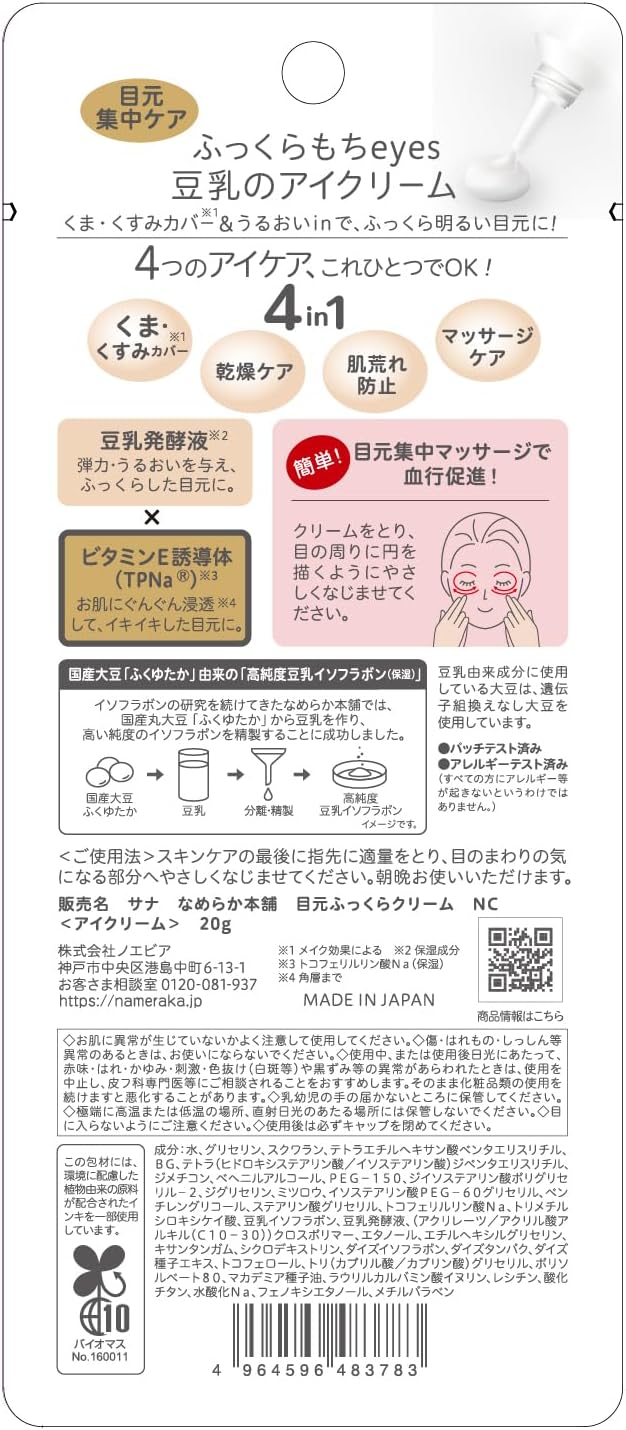 Creme para os olhos para proteção contra os olhos. Formulado com líquido de fermentação de leite de soja x derivado de vitamina E (TPNa) para cuidar de olhos escuros, opacidade, pele seca e com erupções cutâneas, e para olhos mochy brilhantes e fofos. Óleo sem perfume e sem minerais.