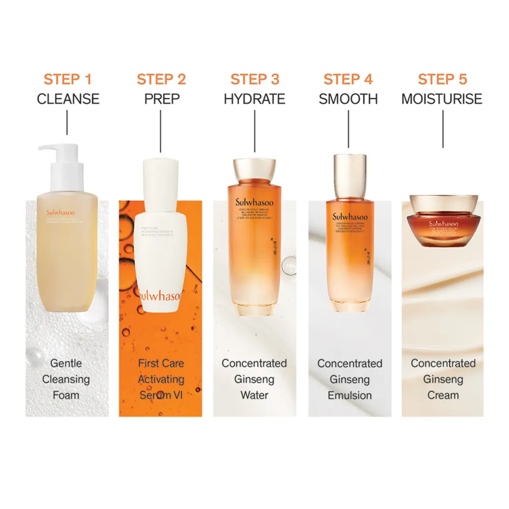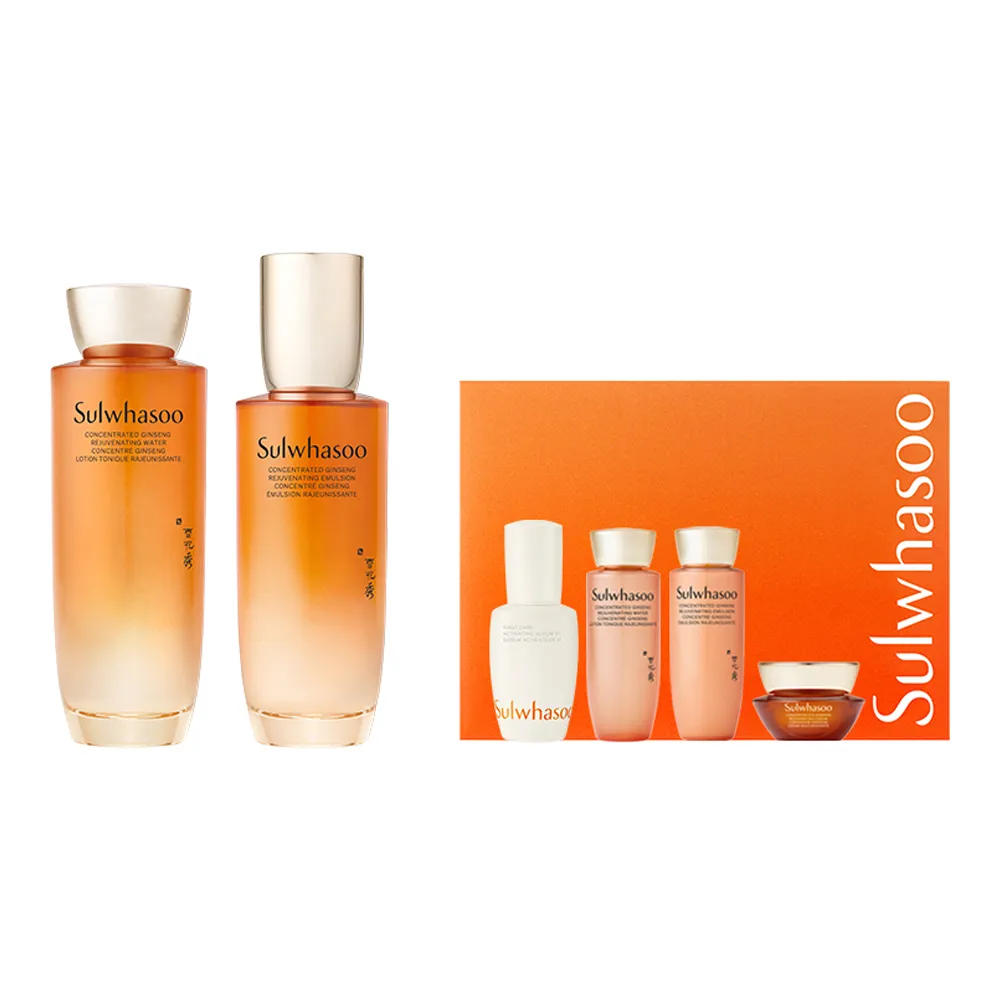 Este conjunto premium de cuidados com a pele oferece uma rotina completa com o poder do Ginseng para alcançar uma pele mais firme, elástica e radiante. O kit inclui a Água Rejuvenescedora Concentrada de Ginseng e a Emulsão em tamanho real, além de quatro miniaturas perfeitas para viagem, incluindo o best-seller First Care Activating Serum VI.