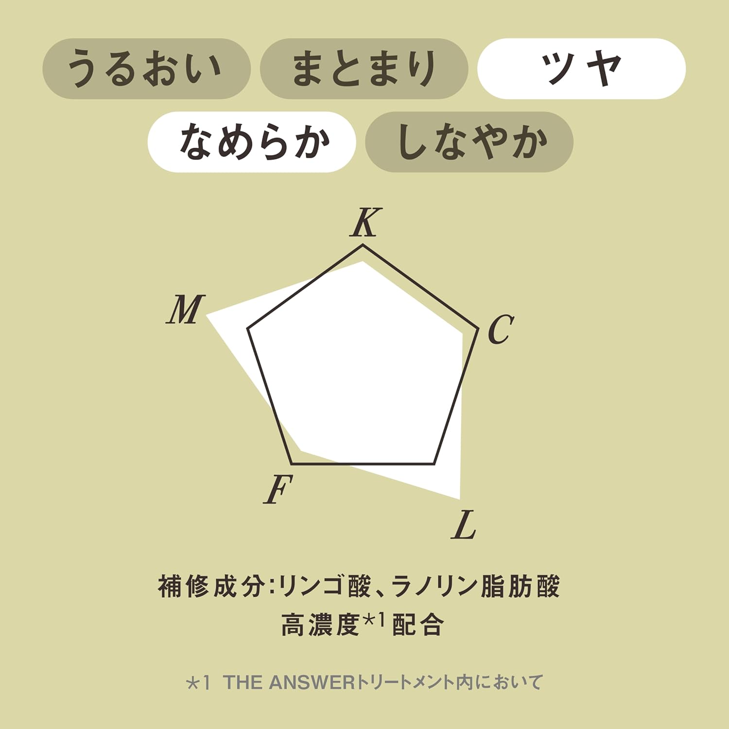 Água, álcool cetearílico, dimeticona, glicerina, cocoglicerídeos de caprílico/cáprico, lanolina hidrogenada, óleo de oliva, óleo de argan, óleo de jojoba, esqualano, ceramida NG, queratina hidrolisada (de lã), proteína hidrolisada da pérola (conchiolina), ácido málico, niacinamida (vitamina B3), vitamina E (tocoferol), vitamina C (ácido ascórbico), arginina, ácido aspártico, glicina, alanina, serina, valina, isoleucina, prolina, treonina, histidina, fenilalanina, PCA de sódio, lactato de sódio, poliquatérnio-67, cloreto de guar hidroxipropiltrimônio, benzoato de sódio, fenoxietanol, fragrância.