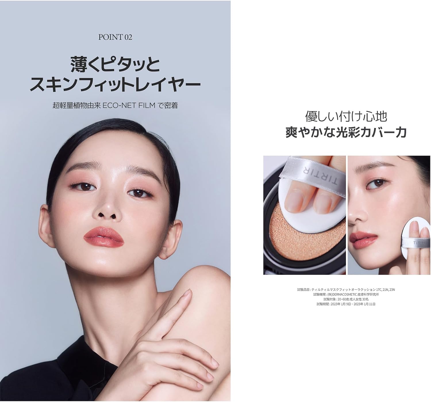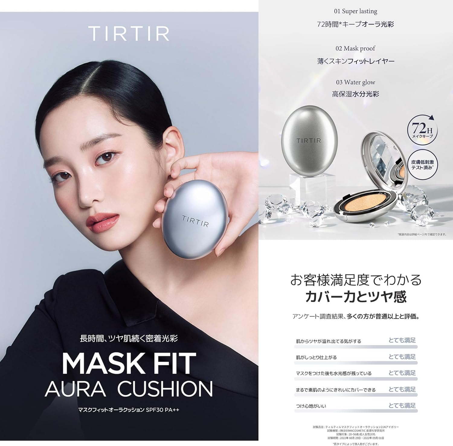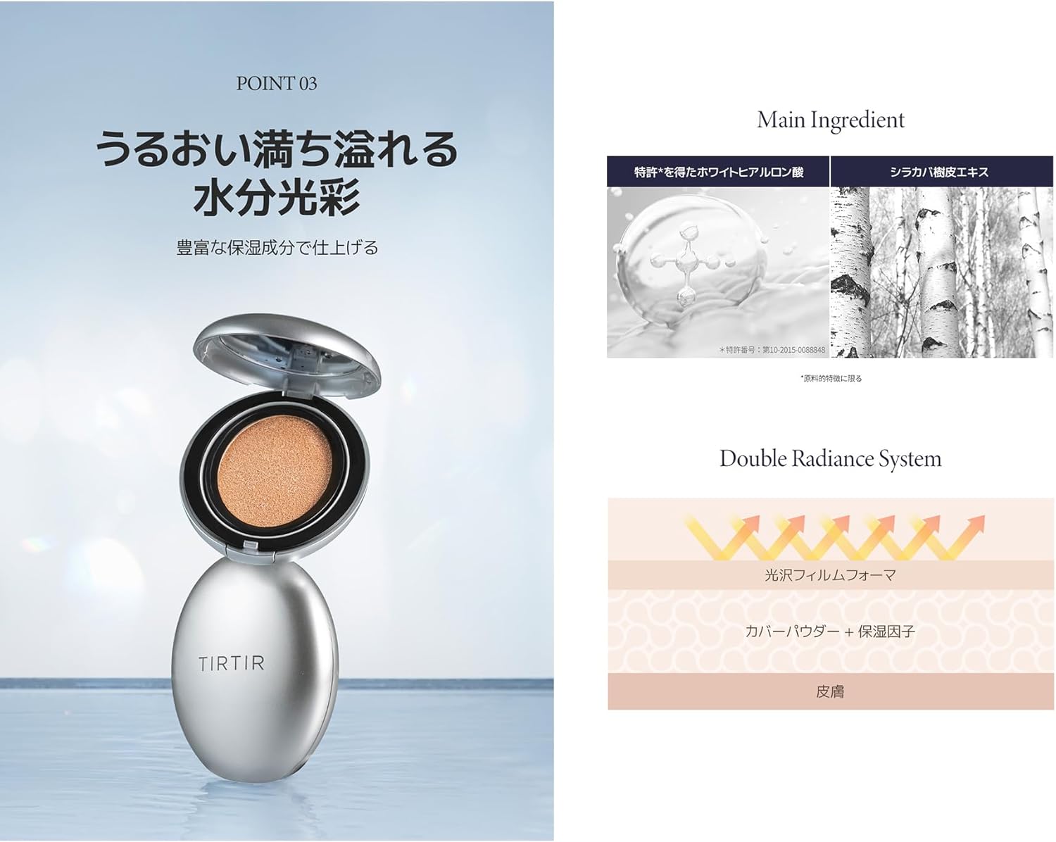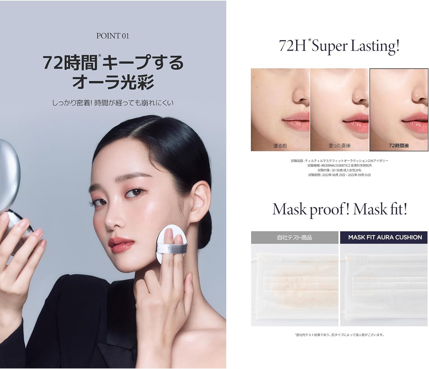 Uma almofada de brilho de aura de 72 horas que adere à pele e se acumula. Cobertura úmida e densa com uma camada adequada à pele que respira na pele. O filme econet derivado de plantas adere à pele em uma camada fina que faz com que pareça que está respirando e contém ácido hialurônico branco e seiva de bétula para criar uma pele úmida e brilhante.