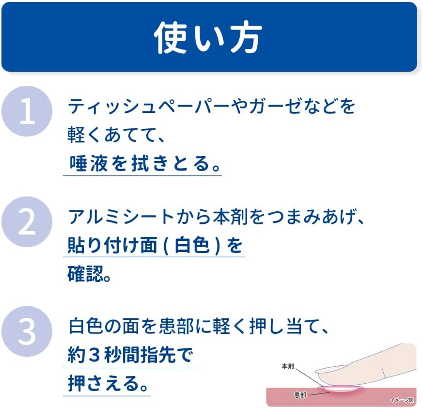 É um “patch” (adesivo) muito fino que adere diretamente à ferida. Uma vez aplicado, torna-se quase impercetível e protege a afta do contacto com a língua, dentes ou alimentos.