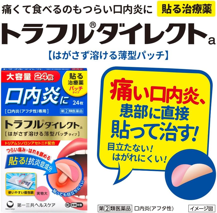 Traful Direct concebido especificamente para o tratamento de aftas (estomatite aftosa). Ao contrário de pomadas que podem espalhar-se na boca, este produto utiliza uma película adesiva ultrafina.