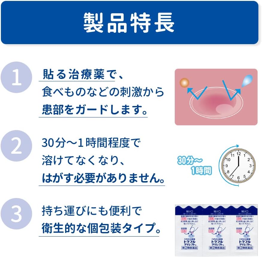 O adesivo foi desenhado para se dissolver gradualmente na boca, eliminando a necessidade de o remover manualmente, o que evita irritar ainda mais a zona sensível.