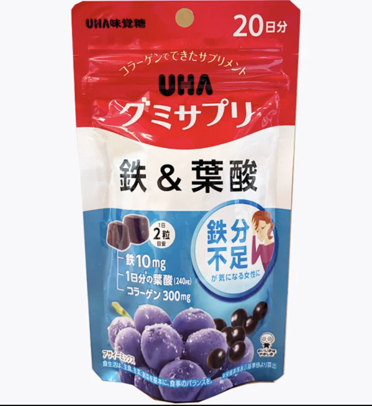 Suplemento em goma (tipo jujuba) com ferro + ácido fólico + colágeno, sabor açaí mix.