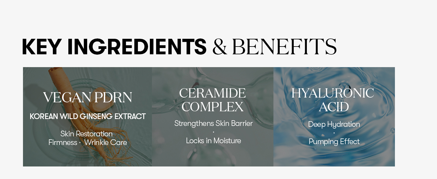 Água, Glicerina, Poliglicerina-3, 1,2-Hexanodiol, Hidroxiacetofenona, Triglicerídeo Caprílico/Cáprico, Copolímero de Acrilato de Sódio/Acriloildimetil Taurato de Sódio, Poliacriloildimetil Taurato de Sódio, Poliisobuteno, Extrato do Fruto de Cocos Nucifera (Coco), Estearato de Poligliceril-10, Butilenoglicol, Laurato de Poligliceril-10, Trealose, Oleato de Sorbitana, Caprilil/Capril Glicosídeo, Amido de Milho Hidrolisado, Fosfatidilcolina Hidrogenada, Sacarose, Tocoferol, Pantenol, Esqualano, Lecitina Hidrogenada, Lauroil Glutamato de Sódio, Álcool Cetoestearílico, Manteiga de Butyrospermum Parkii (Karité), Ácido Esteárico, Hialuronato de Sódio, Extrato da Raiz de Panax Ginseng, Ceramida NP, Ceramida NS, Colesterol, Fitoesfingosina, DNA de Sódio, Ceramida AP, Ceramida AS, Ceramida EOP